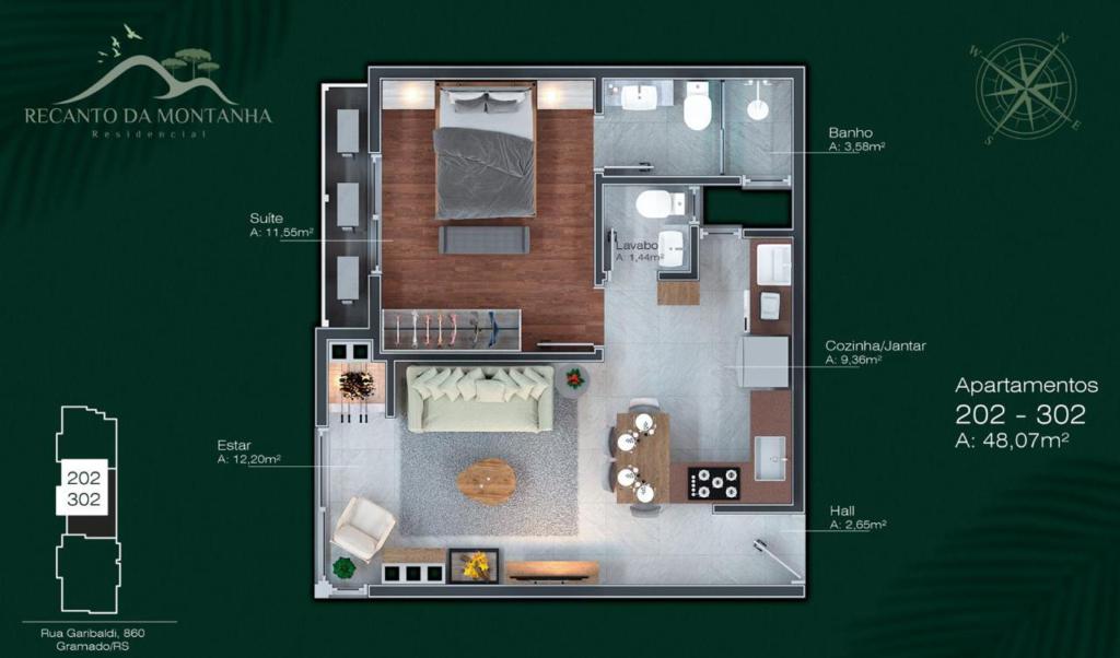 Características: 01 Suíte, Área de Serviço, Cozinha integrada, Espera para água quente, Espera para lareira, Espera para split, Lavabo, Sacada integrada com churrasqueira, Sala de Estar, Sala de Jantar