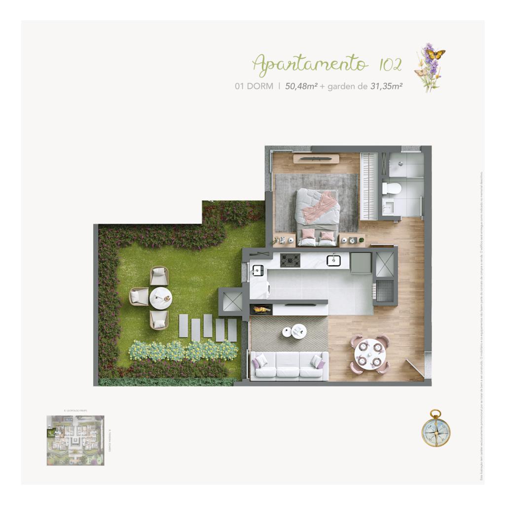 Características: 01 Dormitório, Área de Serviço, Banheiro Social, Cozinha integrada com churrasqueira, Espera para água quente, Espera para lareira, Espera para split, Fechadura digital, Garden, Sala de Estar, Sala de Jantar