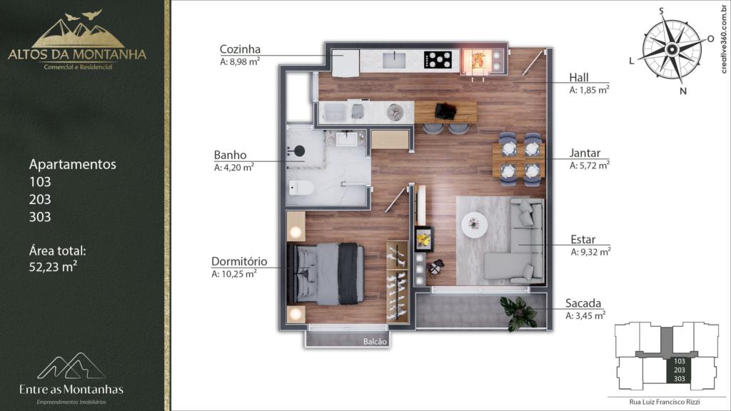 Características: 01 Dormitório, Área de Serviço, Banheiro Social, Cozinha integrada com churrasqueira, Espera para água quente, Espera para calefação, Espera para lareira, Espera para split, Sacada, Sala de Estar, Sala de Jantar