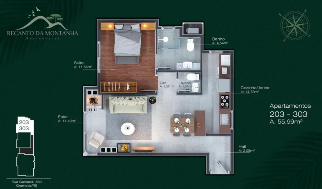 Características: 01 Suíte, Área de Serviço, Cozinha integrada, Espera para água quente, Espera para lareira, Espera para split, Lavabo, Sacada integrada com churrasqueira, Sala de Estar, Sala de Jantar