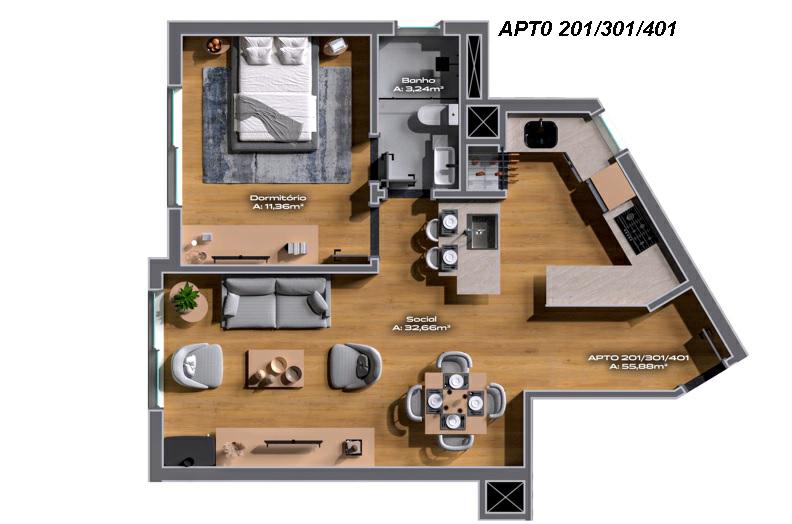 Características: 01 Dormitório (01 suíte), Área de Serviço, Cozinha integrada com churrasqueira, Espera para água quente, Espera para calefação, Espera para lareira a gás, Espera para split, Sala de Estar, Sala de Jantar, suite americana