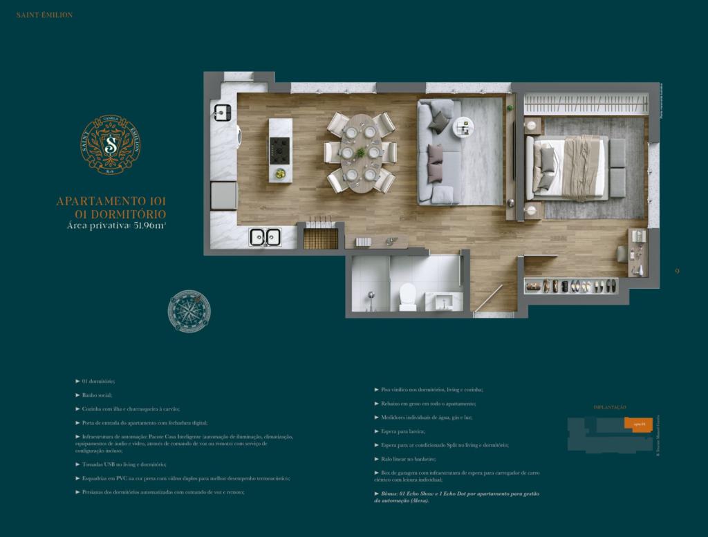 Empreendimento Saint Émilion, arquitetura clássica com inspiração francesa, projetado para atender às necessidades do seu estilo de vida. Apartamento de 01 dormitório, banheiro social com espera para split e lareira, cozinha integrada com churrasqueira e amplo living. Localizado no bairro Centro em Canela, a poucos minutos da Catedral de Pedra.
