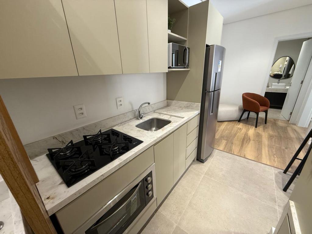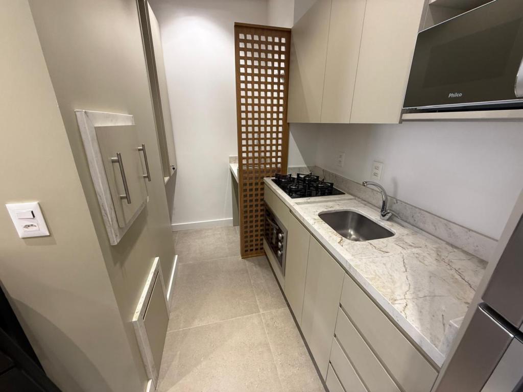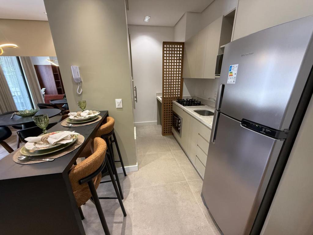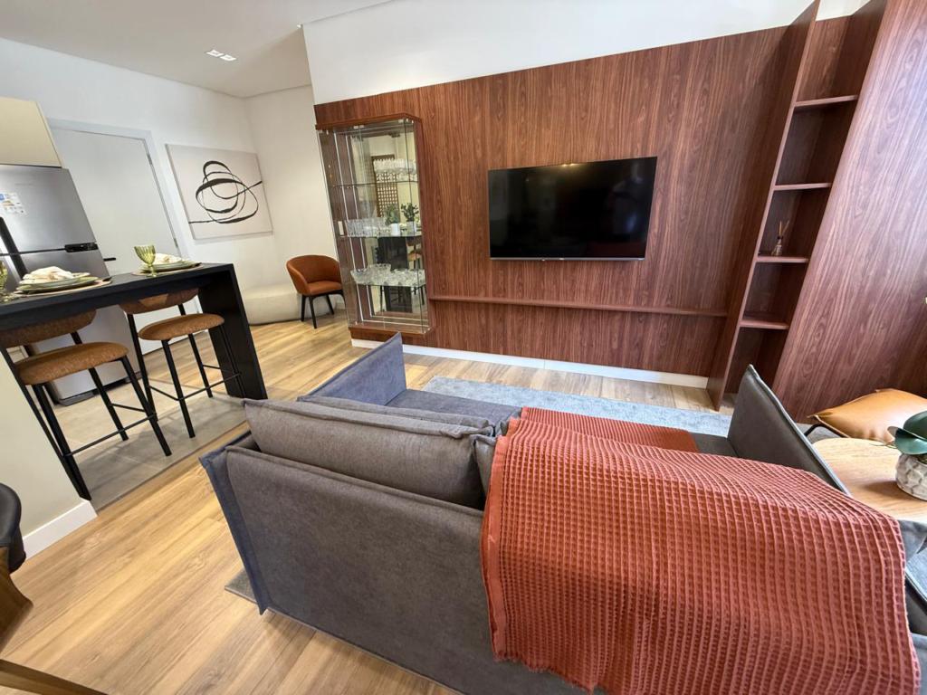 Características: 01 Dormitório, Área de Serviço, Banheiro Social, Cozinha integrada com churrasqueira, Espera para lareira, Espera para split, Mobiliado, Sacada, Sala de Estar, Sala de Jantar