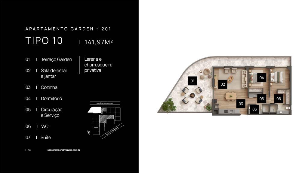Características: 02 Dormitórios (01 suíte), Área de Serviço, Banheiro Social, Cozinha integrada com churrasqueira, Espera para água quente, Espera para calefação, Espera para lareira, Espera para split, Fechadura digital, Garden, Sala de Estar, Sala de Jantar