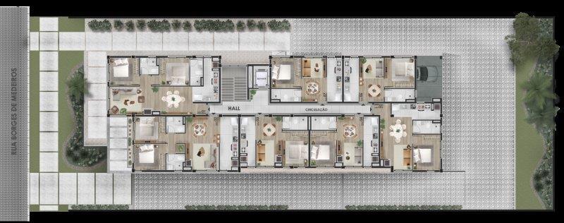 Características: 02 Dormitórios (01 suíte), Área de Serviço, Banheiro Social, Cozinha integrada com churrasqueira, Espera para água quente, Espera para automação residencial, Espera para split, Lareira, Sala de Estar, Sala de Jantar