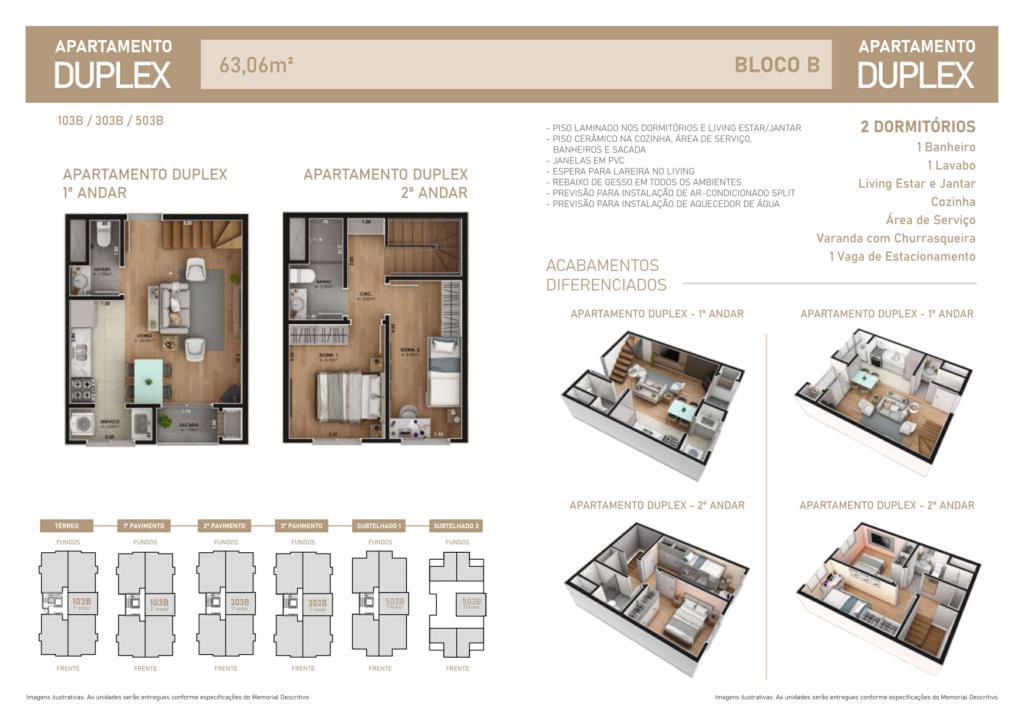 Características: 02 Dormitórios, Área de Serviço, Banheiro Social, Cozinha integrada, Duplex, Espera para água quente, Espera para lareira, Espera para split, Esquadrias externas em PVC com vidro duplo, Lavabo, Sacada com churrasqueira, Sala de Estar, Sala de Jantar