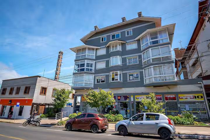 Apartamento de 02 dormitórios (1 suíte), banheiro social, com o conforto de espera para calefação, split e lareira, cozinha integrada com churrasqueira e 1 vaga de estacionamento, no Centro de Canela, imediações da Catedral de Pedra.