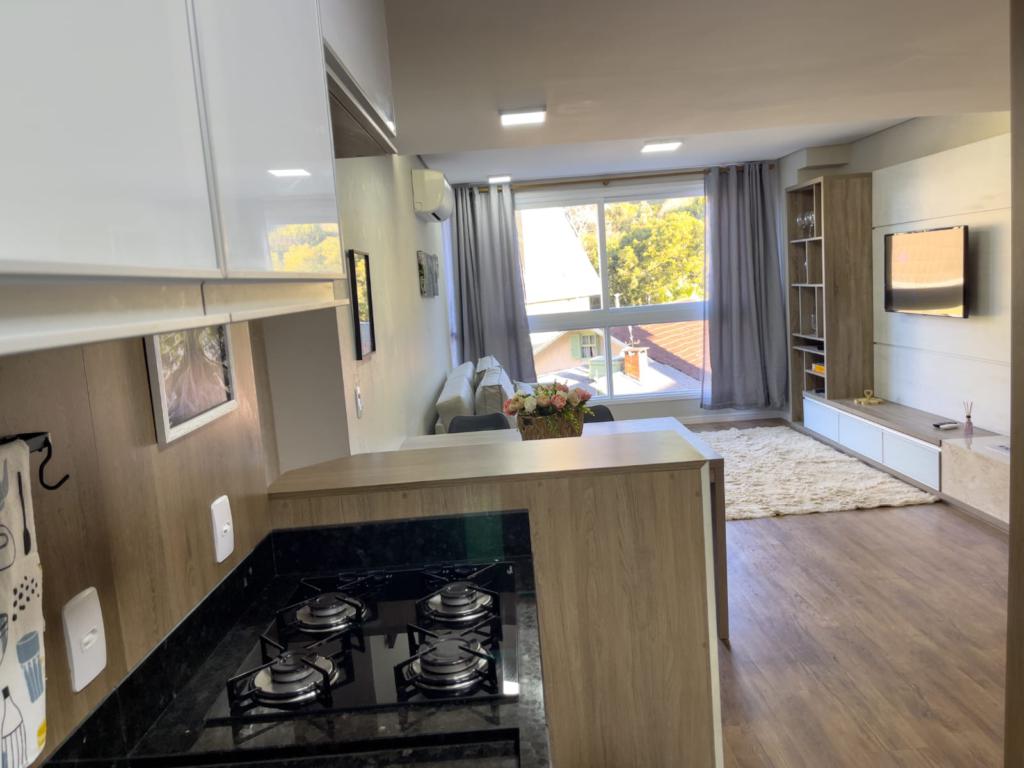 Apartamento de 02 dormitórios (01 suite), mobiliado, cozinha integrada com churrasqueira, sala de jantar e estar com lareira. Localizado em Bairro tranquilo, calmo e seguro, junto ao Centro de Gramado.