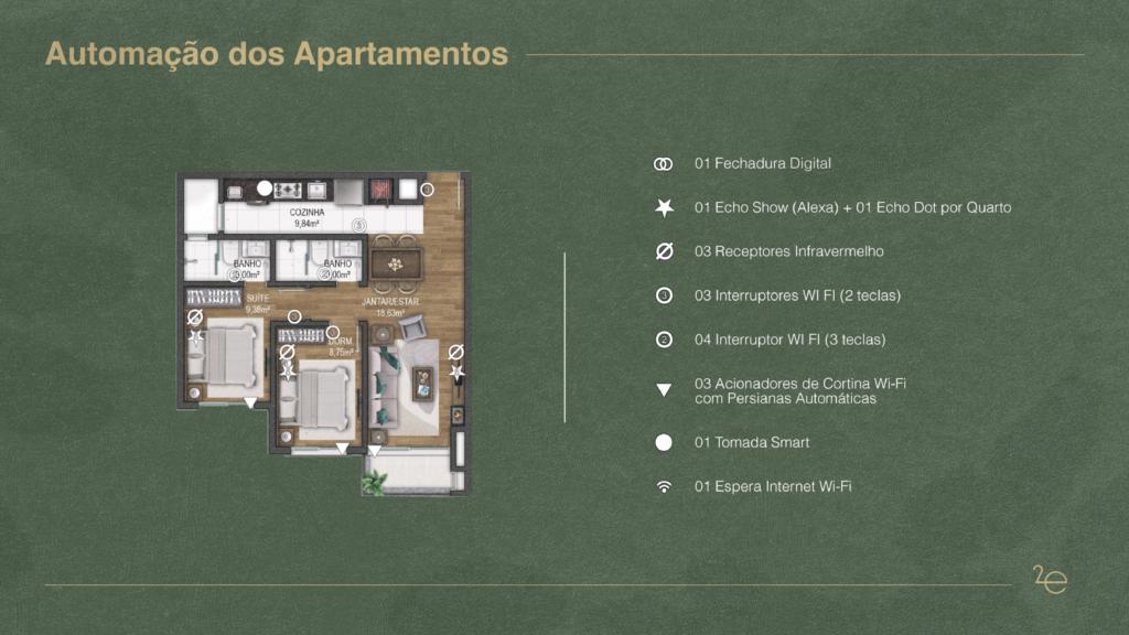 Características: 02 Dormitórios (01 suíte), Área de Serviço, Automação Residencial, Banheiro Social, Cozinha integrada com churrasqueira, Echo Show (Alexa) + Echo Dot, Espera para água quente, Espera para calefação, Espera para lareira, Espera para split, Fechadura digital, Sacada, Sala de Estar, Sala de Jantar