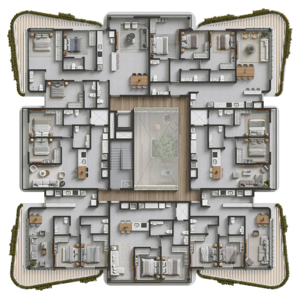 Infraestrutura: Aproveitamento de água da chuva, Área de Lazer, Elevador inteligente, Energia solar nas áreas condominiais, Espaço Fire Fit (Espaço para fogueira ao ar livre), Espaço fitness, Espaço gourmet com churrasqueira, Gás Central, Hall de entrada mobiliado, Jardins e Floreiras tratados, Medidores individuais de água, luz e gás, Piscina Aquecida, Playground, Porteiro eletrônico com vídeo, Reconhecimento Facial, Sauna, SPA