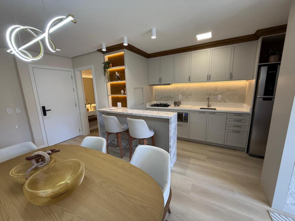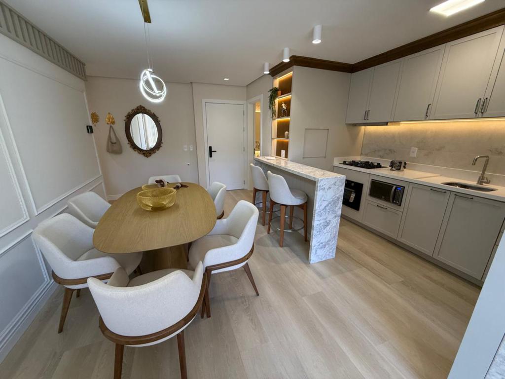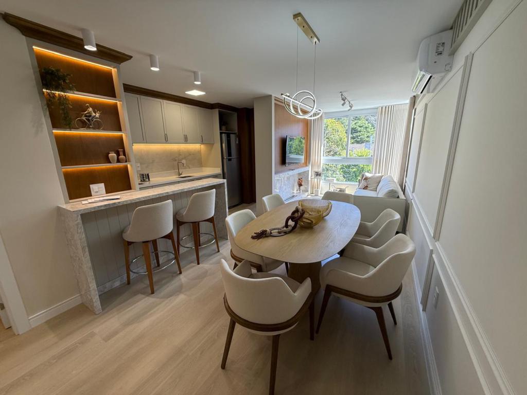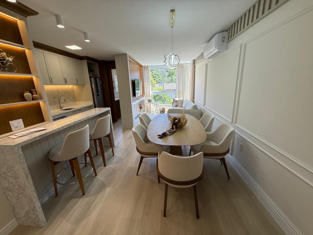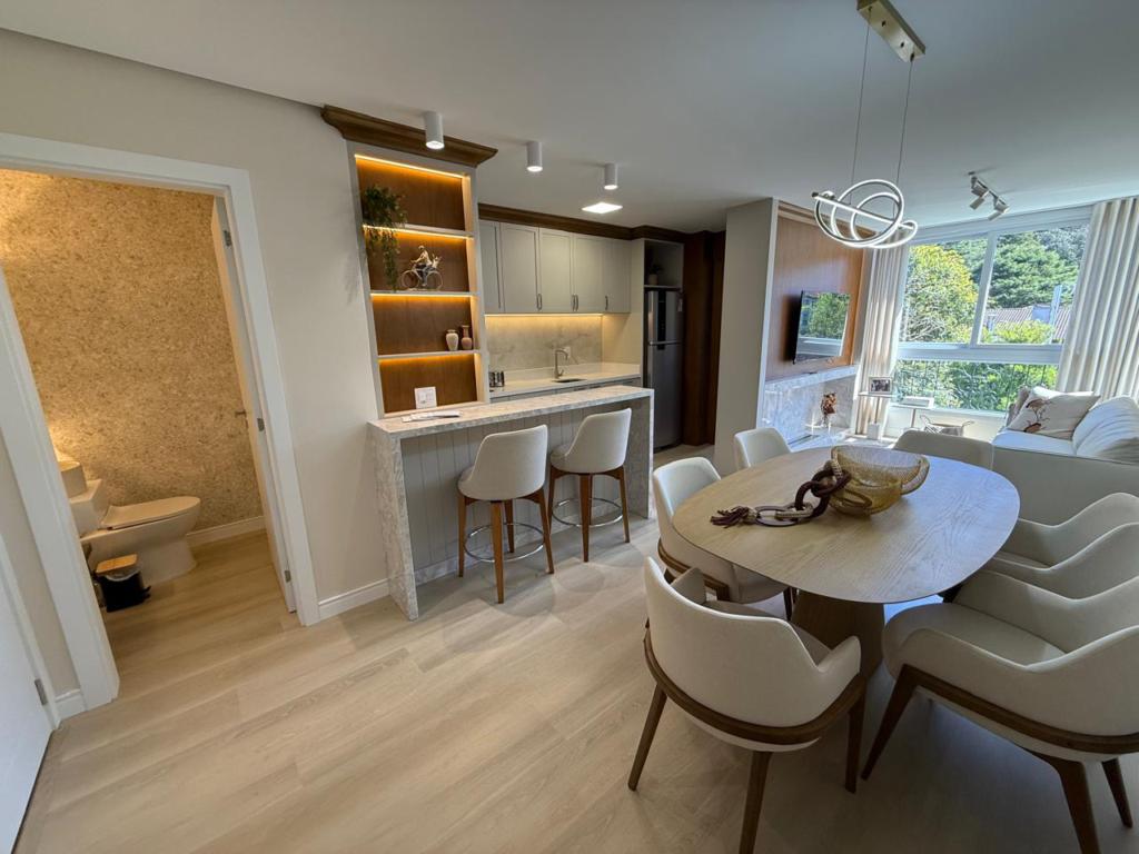 Características: 02 Suítes, Água Quente, Área de Serviço, Cozinha integrada com churrasqueira, Decoração, Espera para calefação, Lavabo, Mobiliado, Piso aquecido nos banheiros das suítes, Sala de Estar com lareira, Sala de Jantar, Split instalado em todas as peças