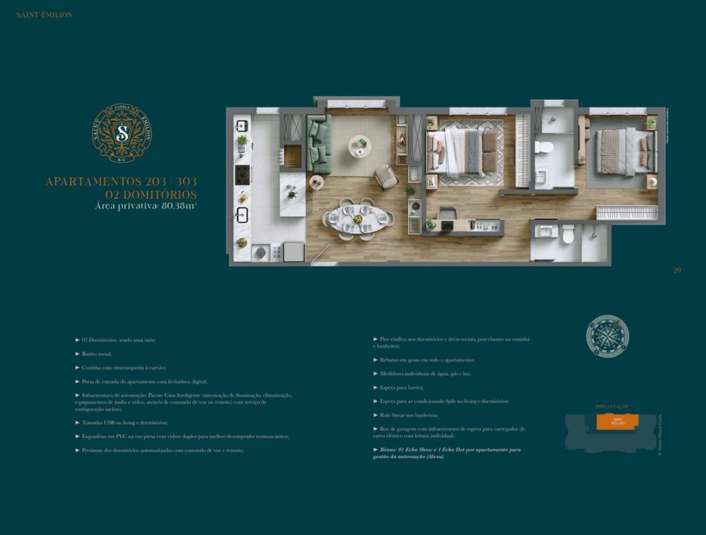 Características: 02 Dormitórios (01 suíte), Área de Serviço, Automação Residencial, Banheiro Social, Cozinha integrada com churrasqueira, Espera para lareira, Espera para split, Fechadura digital, Hall, Sala de Estar, Sala de Jantar
