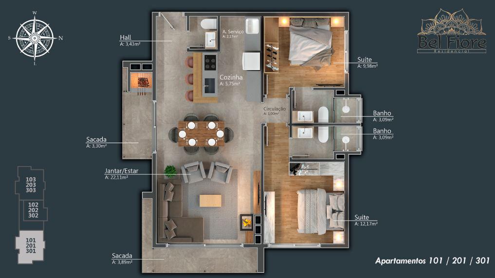 Características: 02 Suítes, Área de Serviço, Cozinha integrada, Espera para água quente, Espera para lareira, Espera para split, Lavabo, Sacada com churrasqueira, Sala de Estar, Sala de Jantar