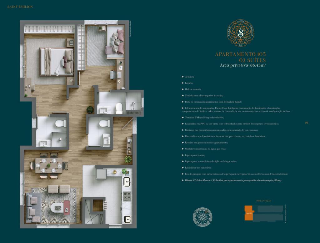 Características: 02 Suítes, Área de Serviço, Automação Residencial, Cozinha integrada com churrasqueira, Espera para lareira, Espera para split, Fechadura digital, Hall, Lavabo, Sala de Estar, Sala de Jantar