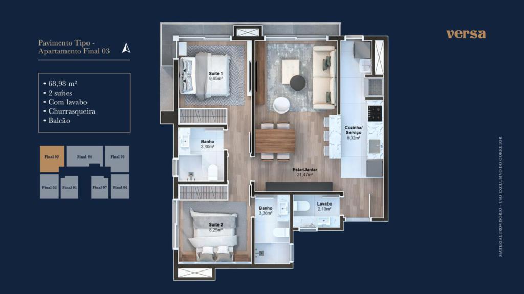Características: 02 Suítes, Área de Serviço, Cozinha integrada com churrasqueira, Espera para água quente, Espera para calefação, Espera para lareira, Espera para split, Fechadura digital, Lavabo, Sala de Estar, Sala de Jantar