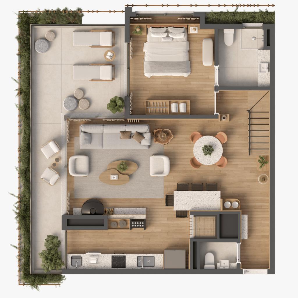 Características: 03 Suítes, Área de Serviço, Cozinha integrada com churrasqueira, Duplex, Espera para água quente, Espera para automação residencial, Espera para lareira, Espera para split, Fechadura digital, Lavabo, Piso aquecido, Sacada, Sala de Estar, Sala de Jantar