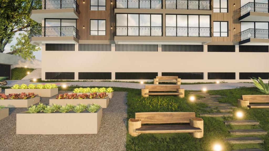 Infraestrutura: Deck externo com fogo de chão, Deck Panorâmico, Elevador, Espaço Fire Fit (Espaço para fogueira ao ar livre), Gás Central, Hall de entrada, Horta comunitária, Medidores individuais de água, luz e gás, Pátio | Jardim, Pomar, Portão Eletrônico, Porteiro Eletrônico, Sala de Fitness Equipada