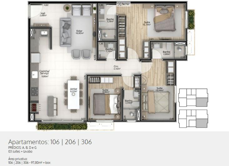 Características: 03 Suítes, Área de Serviço, Banheiro Social, Cozinha integrada com churrasqueira, Espera para split, Lavabo, Sala de Estar, Sala de Jantar