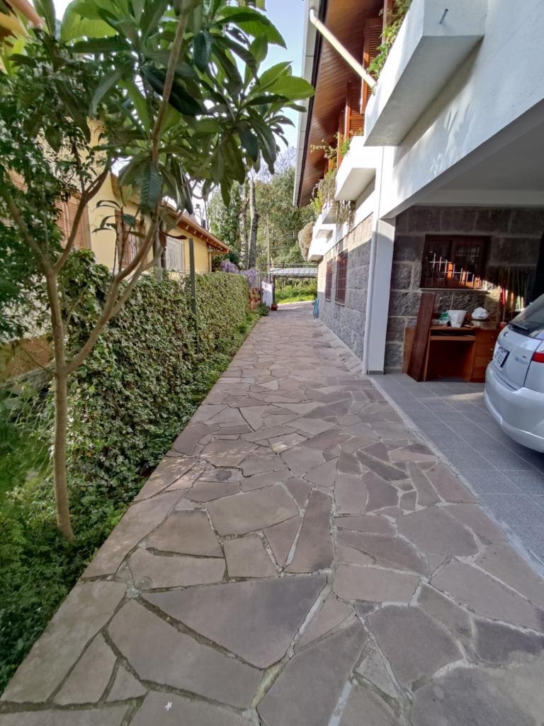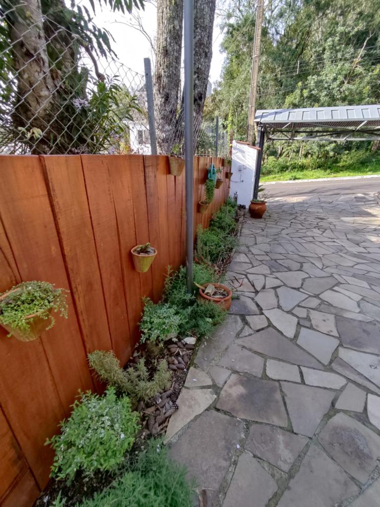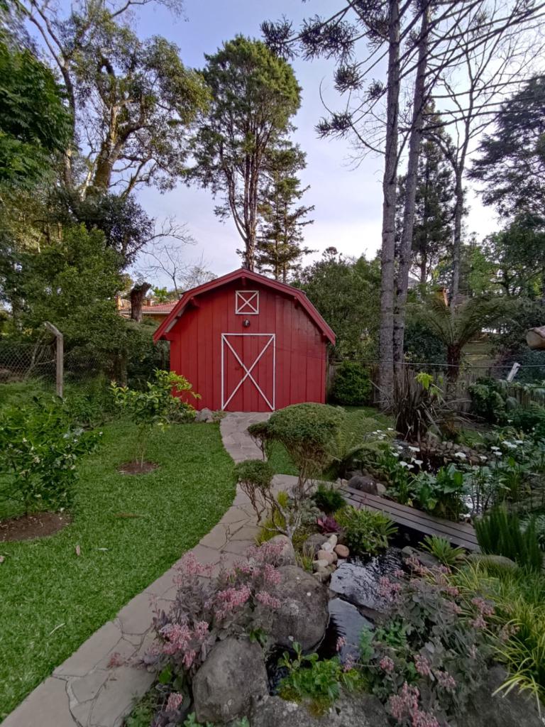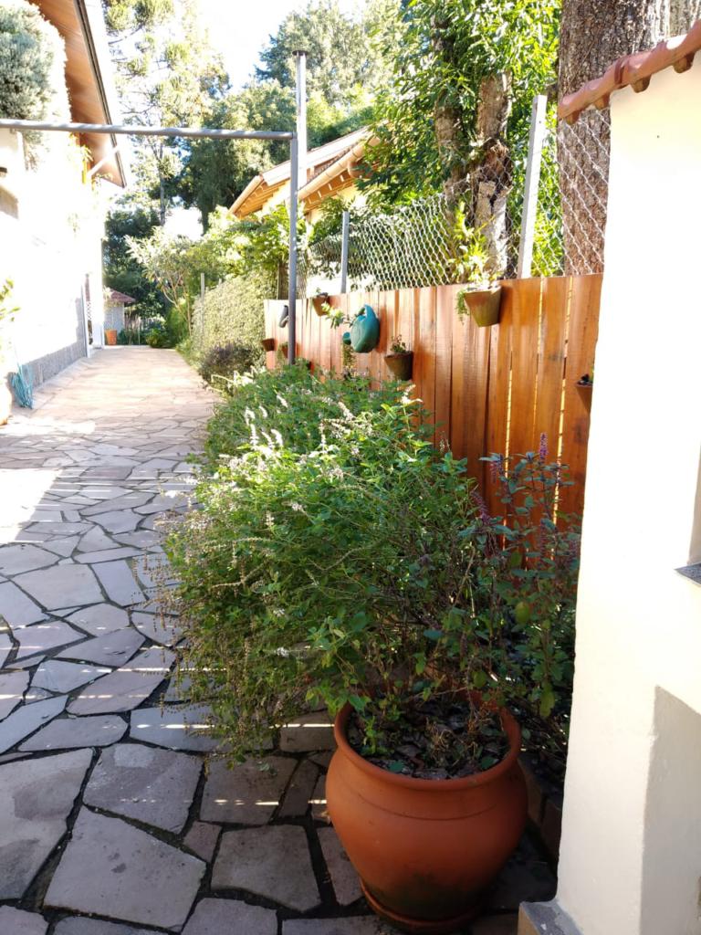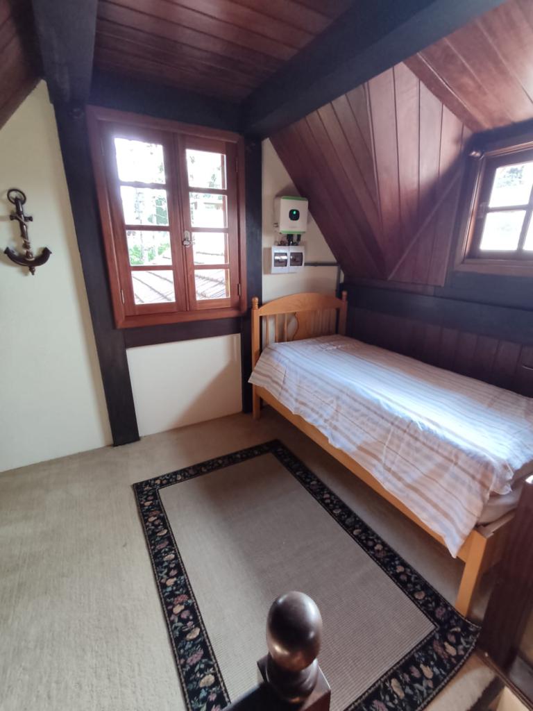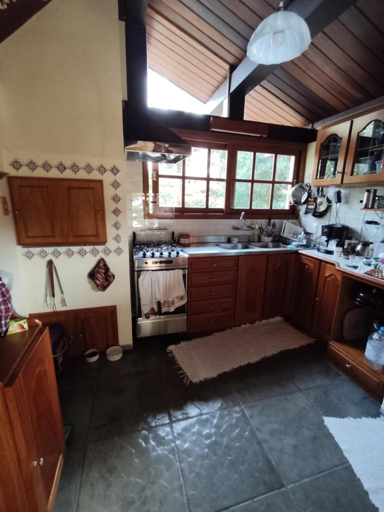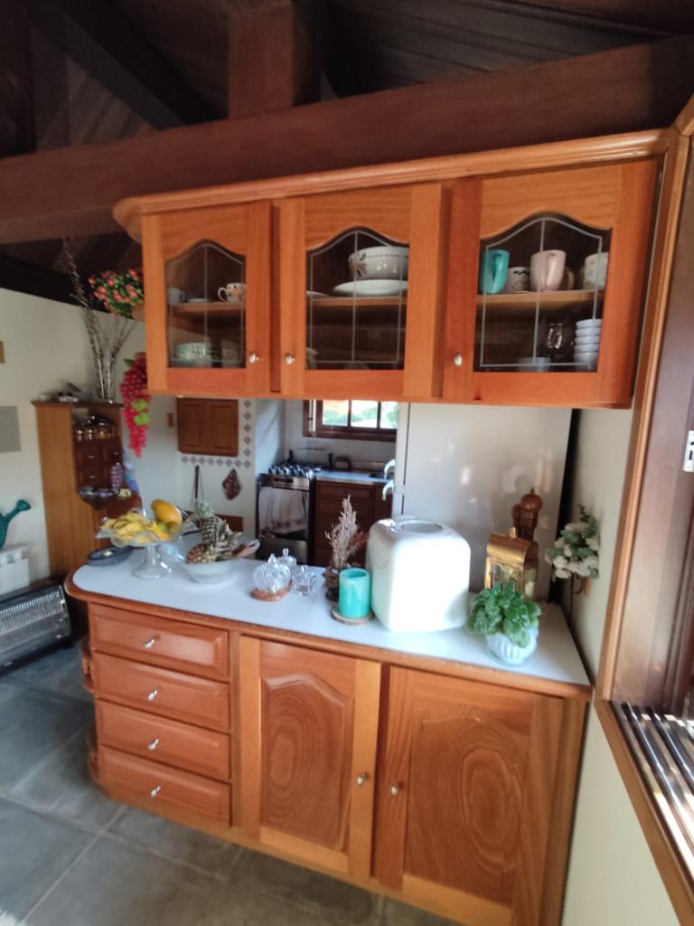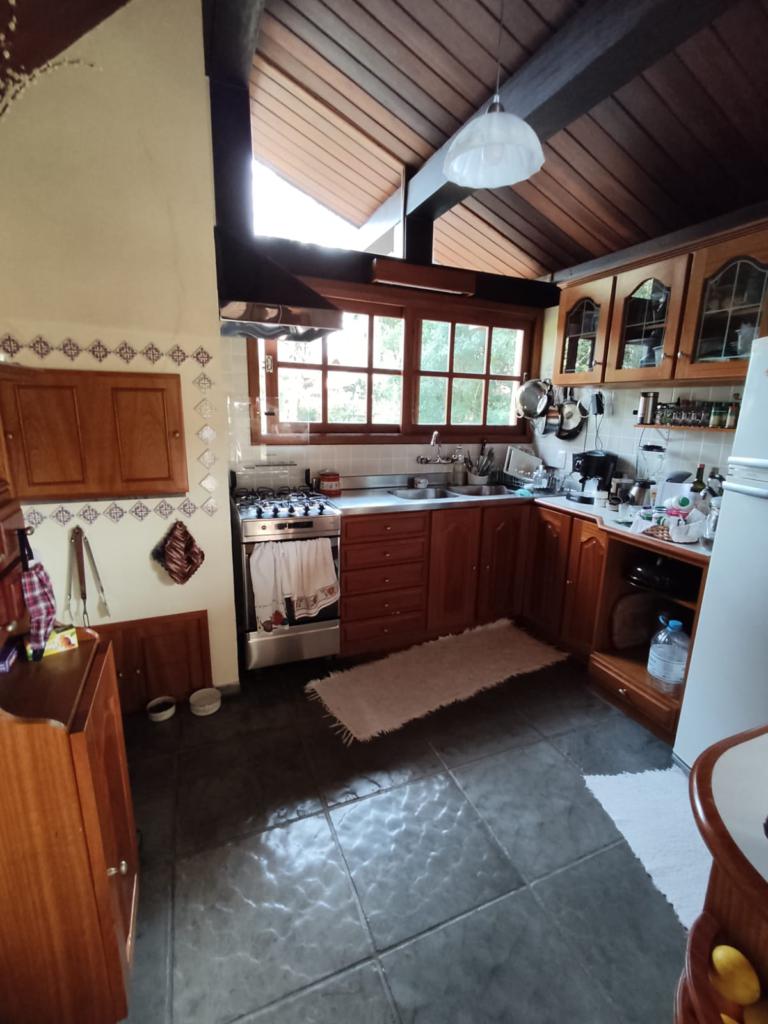 Casa com 5 dormitórios (01 suíte máster com closet e banheira de hidromassagem), 2 dormitórios no 1º piso (garagem), 2º piso; 2 dormitórios, cozinha integrada com churrasqueira, sala de jantar e estar com lareira, mobiliada, 3º piso mais um dormitório. Porão com 4 peças e banheiro social, podendo ser transformado em um apartamento mediante reforma, lavanderia, garagem para 2 carros, galpão nos fundos, lago com água da chuva, água quente com boiler elétrico e calefação a gás. Placas solares e paredes com tijolo duplo e maciço.