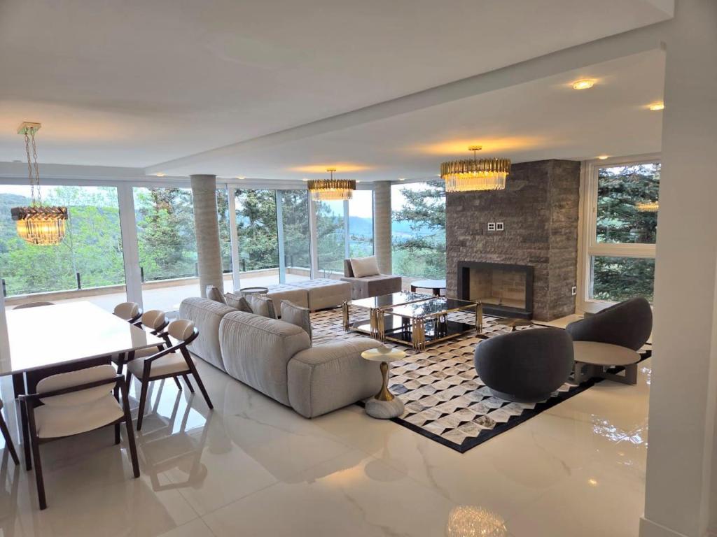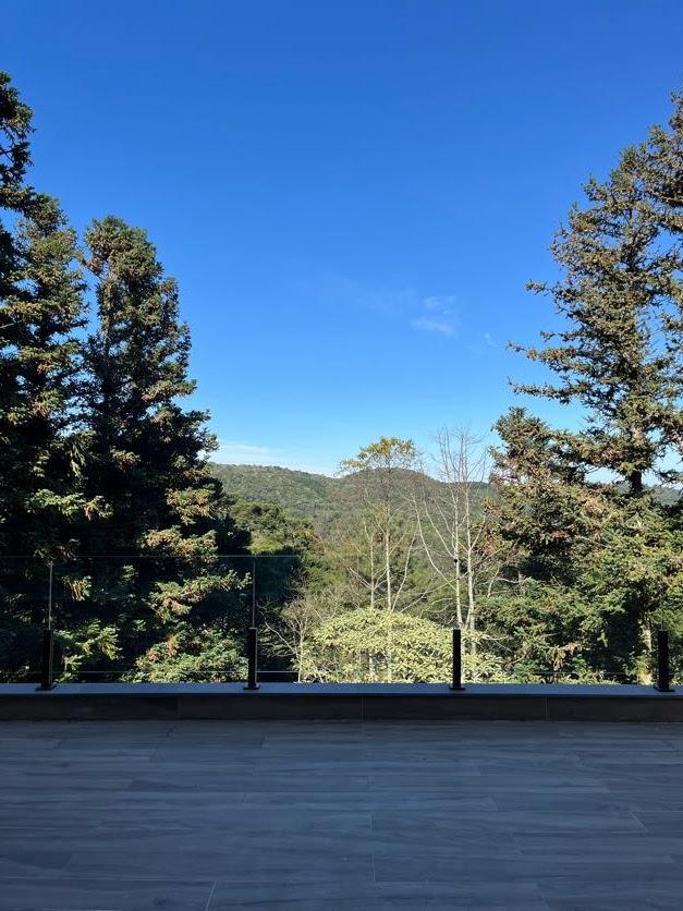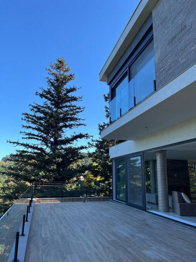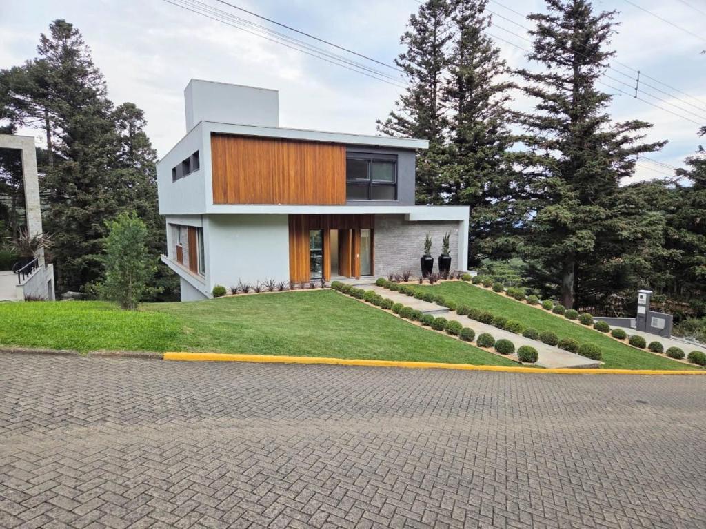 Com uma arquitetura moderna e linhas elegantes, a casa se eleva majestosa no topo de um morro, revelando uma vista deslumbrante para o verde do vale que a envolve.