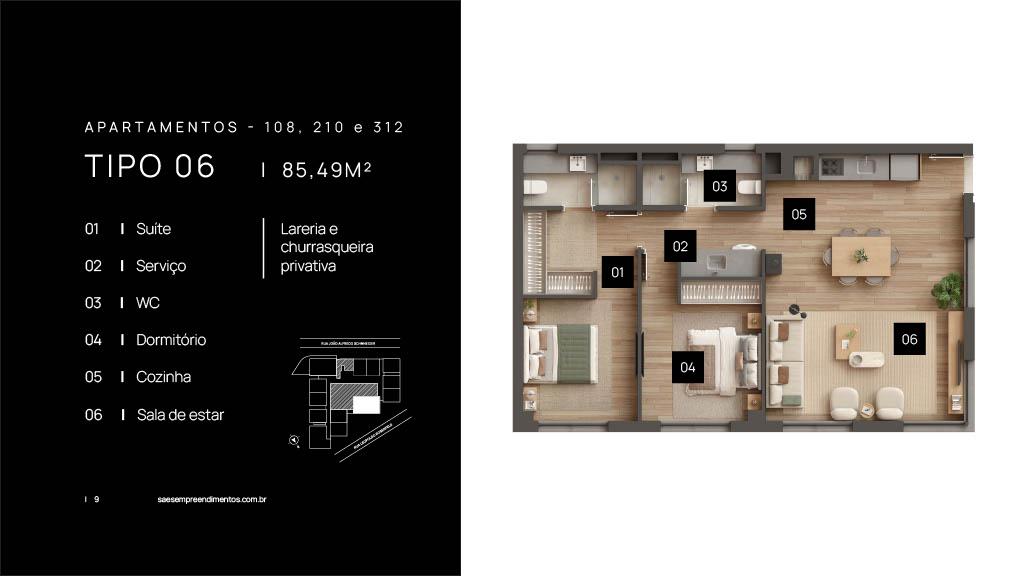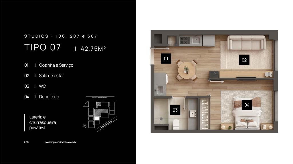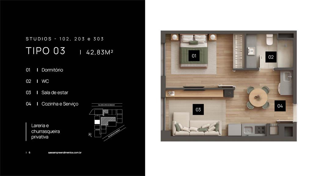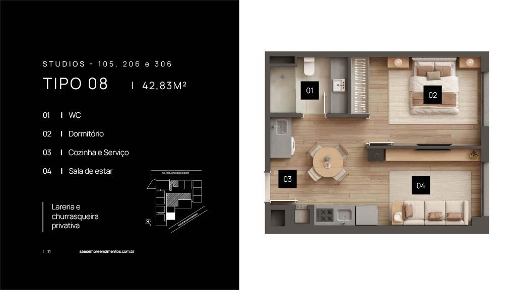 Características: 01 Dormitório, 01 Suíte, 02 Dormitórios (01 suíte), Área de Serviço, Banheiro Social, Cozinha integrada com churrasqueira, Duplex, Espera para água quente, Espera para calefação, Espera para lareira, Espera para split, Fechadura digital, Sala de Estar, Sala de Jantar, Studio