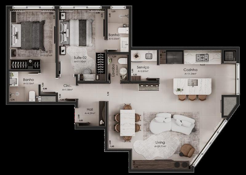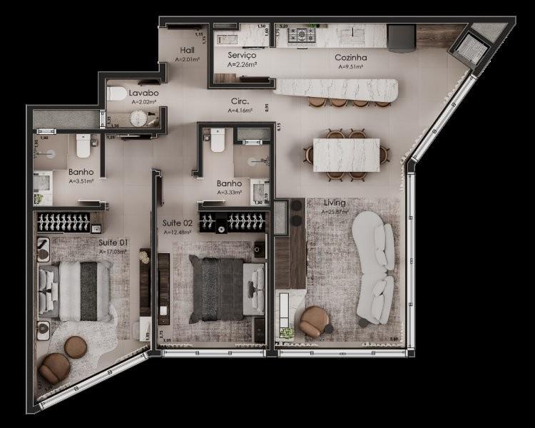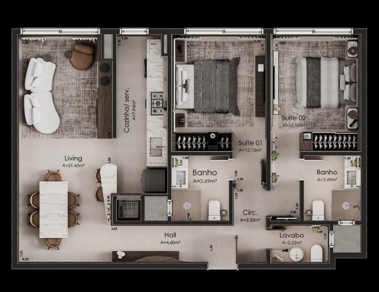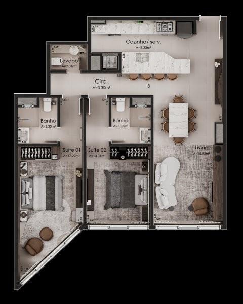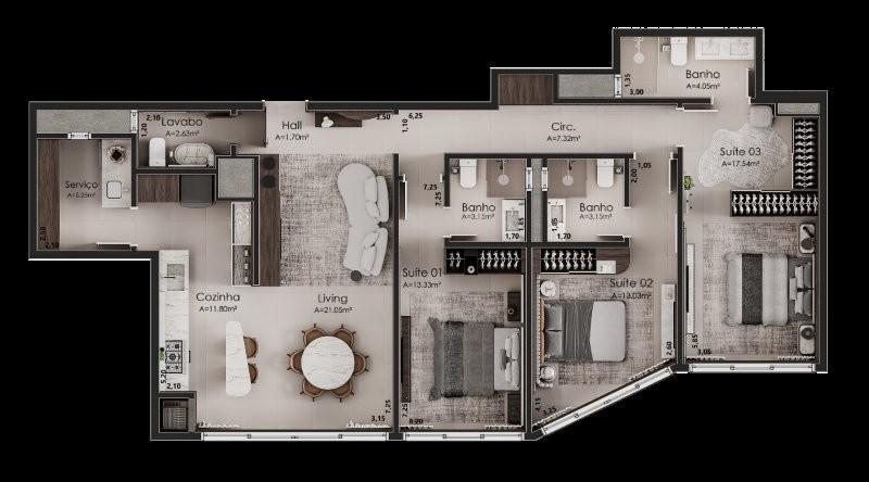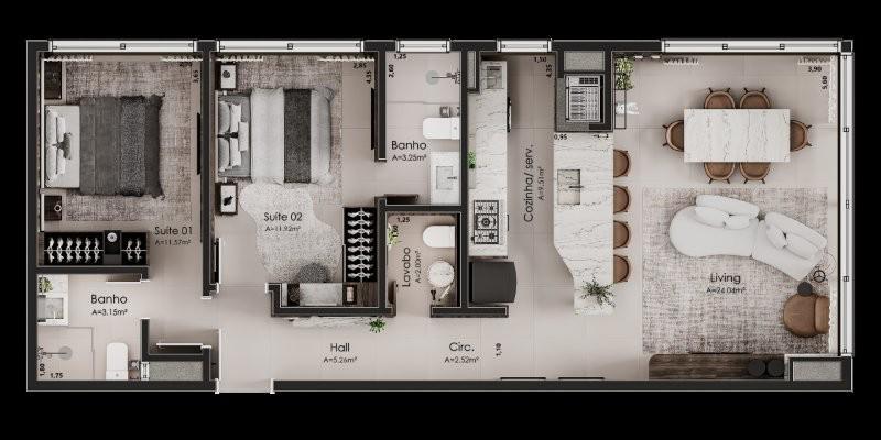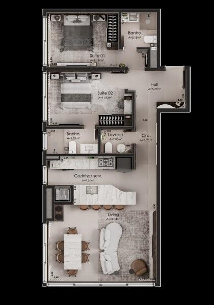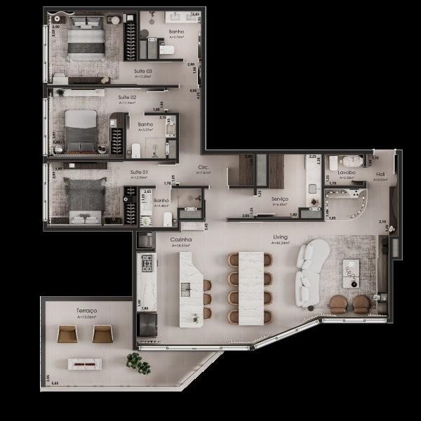 Características: 02 Suítes, 03 Suítes, Área de Serviço, Cozinha integrada com churrasqueira, Espera para água quente, Espera para lareira, Espera para split, Lavabo, Sala de Estar, Sala de Jantar