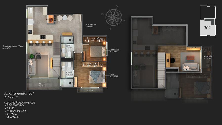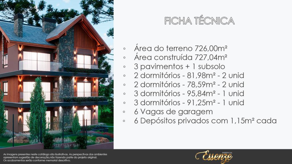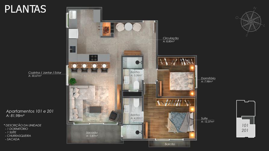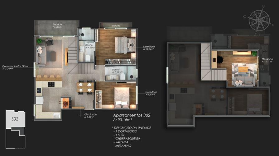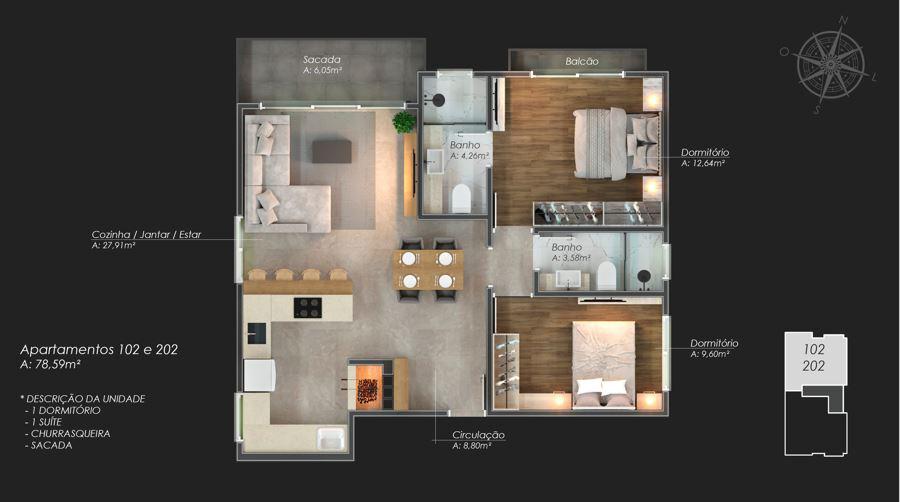 Características: 02 Dormitórios (01 suite), 03 Dormitórios (01 suite), Área de Serviço, Banheiro Social, Cozinha integrada com churrasqueira, Depósito, Espera para água quente, Espera para lareira, Espera para split, Sacada, Sala de Estar, Sala de Jantar