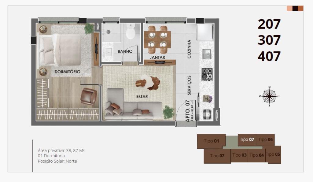 Características: 01 Dormitório, 02 Dormitórios (01 suíte), 02 Suítes, Área de Serviço, Banheiro Social, Cozinha integrada com churrasqueira, Espera para água quente, Espera para automação residencial, Espera para split, Lareira, Sala de Estar, Sala de Jantar