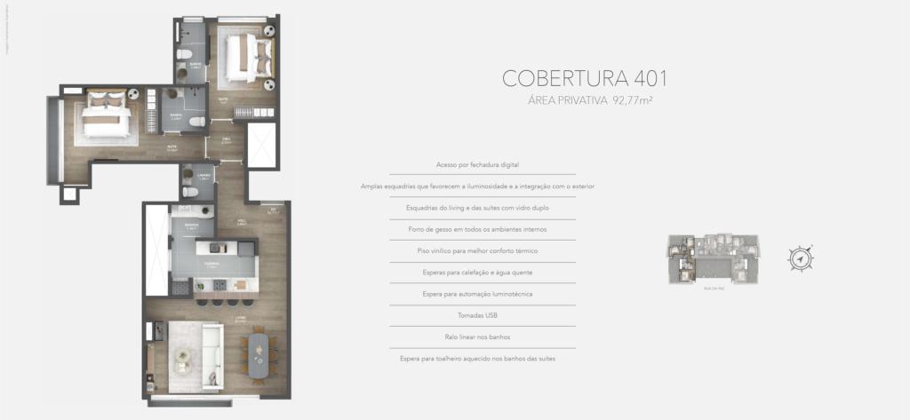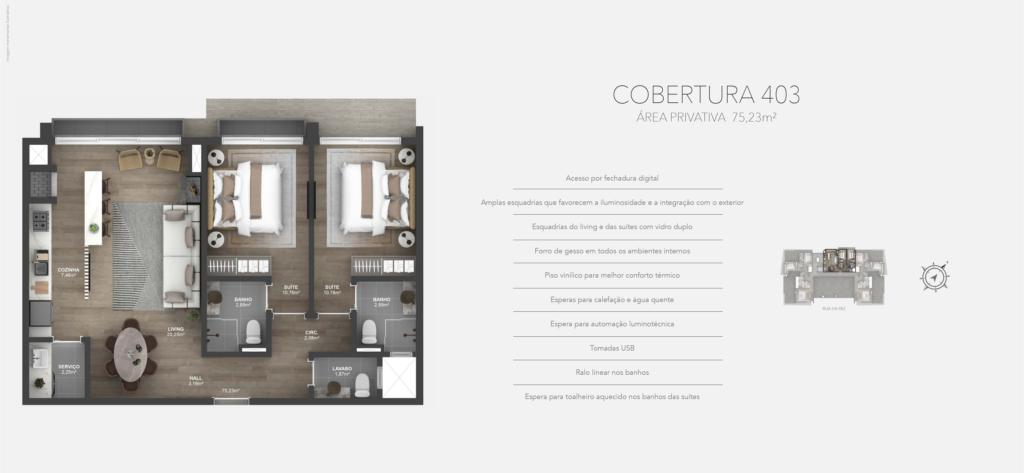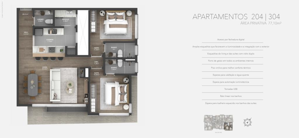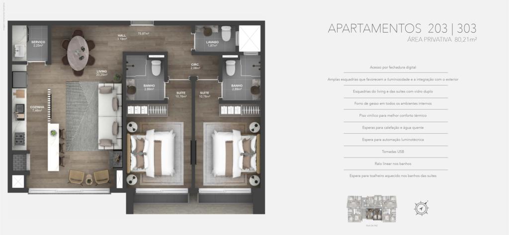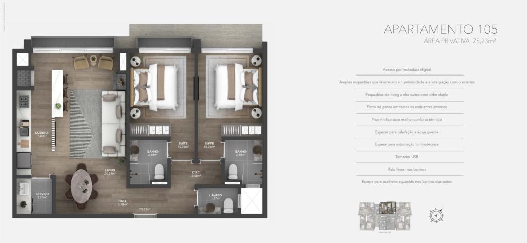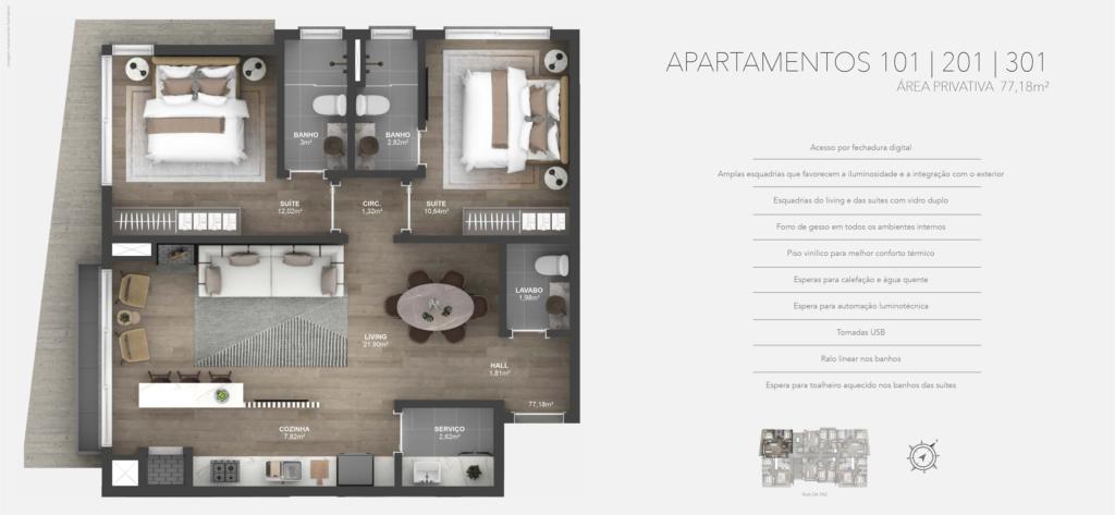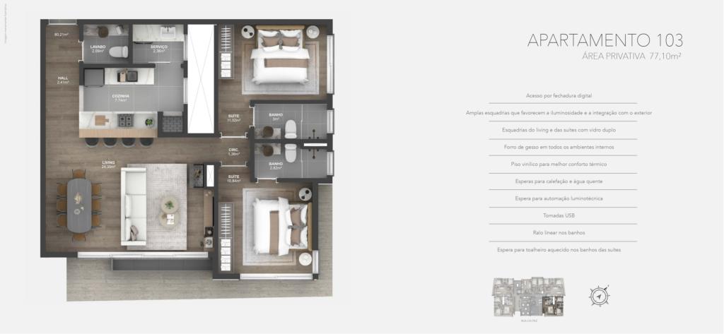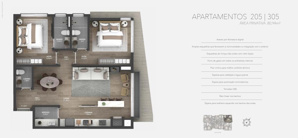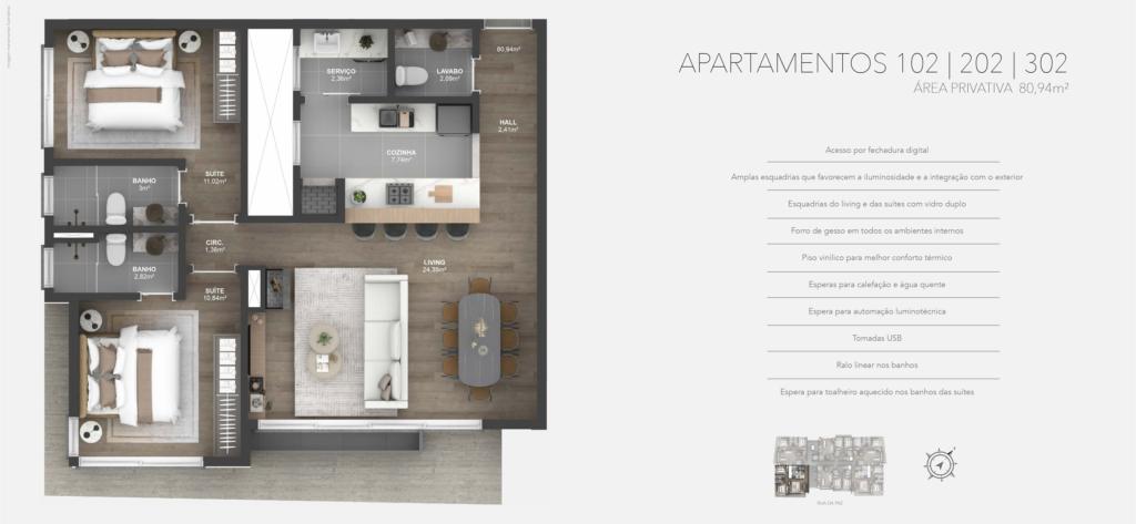 Características: 02 Suítes, Área de Serviço, Cozinha integrada com churrasqueira, Espera para água quente, Espera para calefação, Espera para lareira, Espera para split, Fechadura digital, Lavabo, Sala de Estar, Sala de Jantar